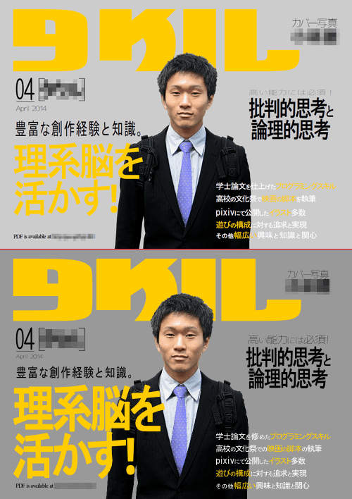 前回紹介した「就活に使った『雑誌の電車の中づり広告風自己紹介』の図案」を,ちょっと修正してみた.どうぞ!
